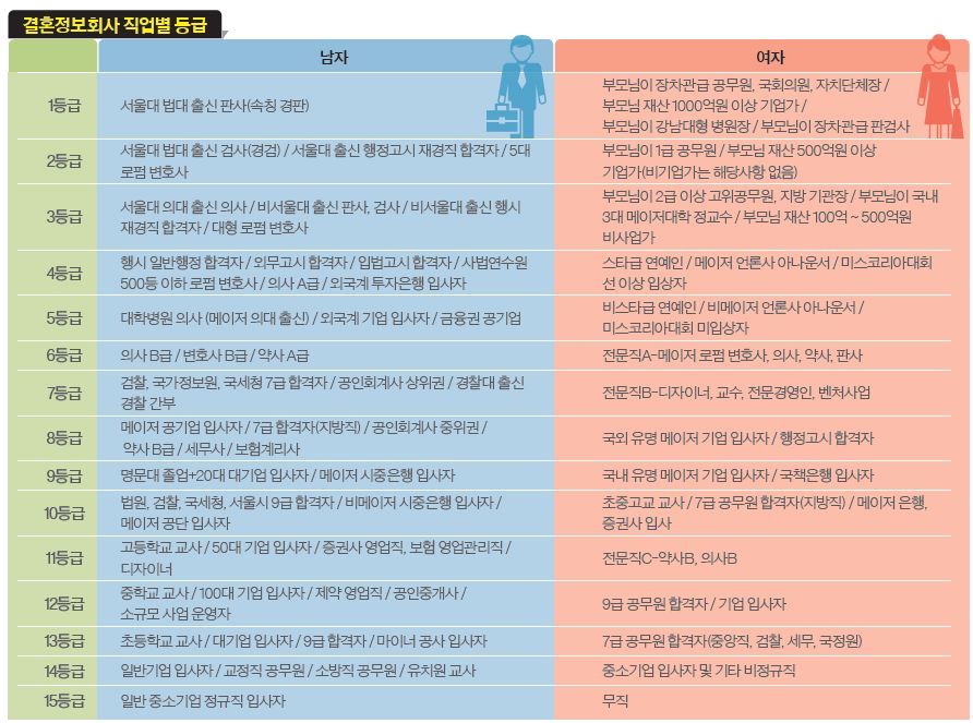 | 등급 | 전문직 | 공기업,금융 | 공무원 | 사기업 | 기타 (직업무관) |