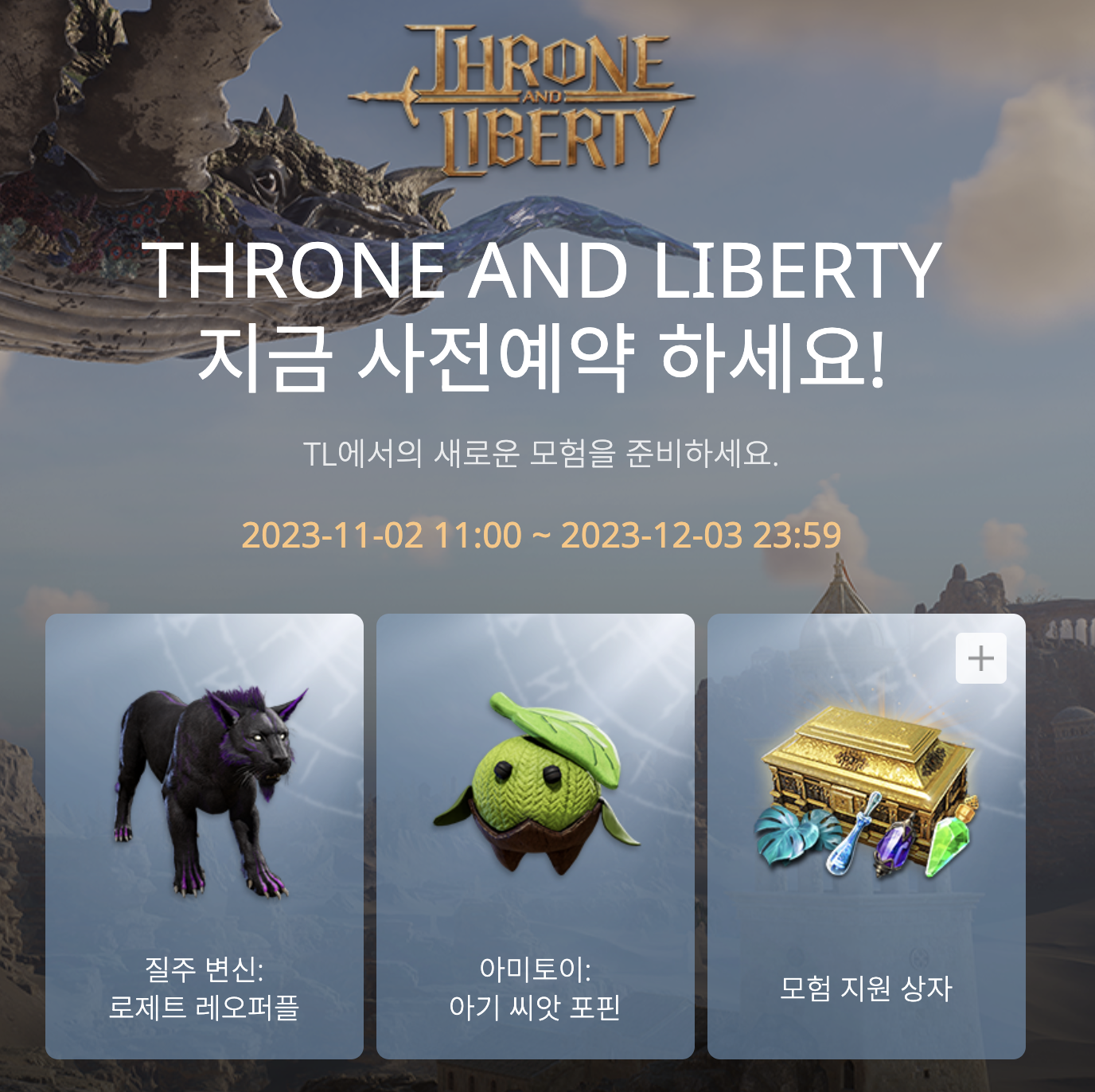 쓰론앤리버티 사전예약 기간은 11월 2일부터 12월 3일까지입니다. 대부분의 게임이 사전예약 기간을 게임 오픈 전날까지 제공하는 것과 약간 다르니 주의하셔야 합니다. 미루지 말고 지금 미리 해두시기 바랍니다.
